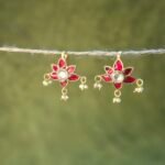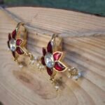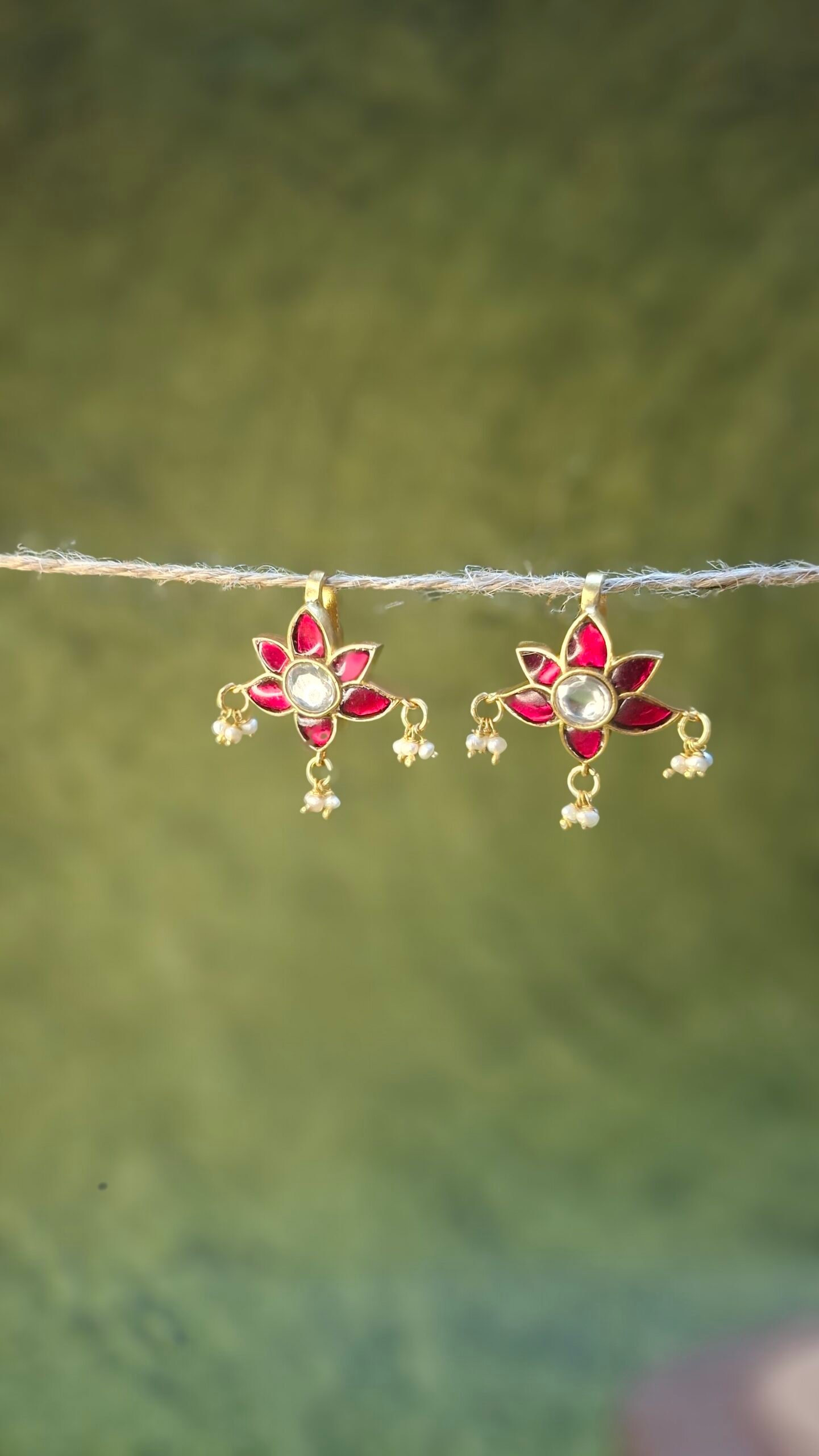 Elegant red floral kundan bugadi earrings crafted with a traditional flower motif, highlighted by a premium mirror-polished kundan center and delicate pearl clusters. Lightweight, vibrant, and perfect for festive wear, traditional outfits, and daily elegance.