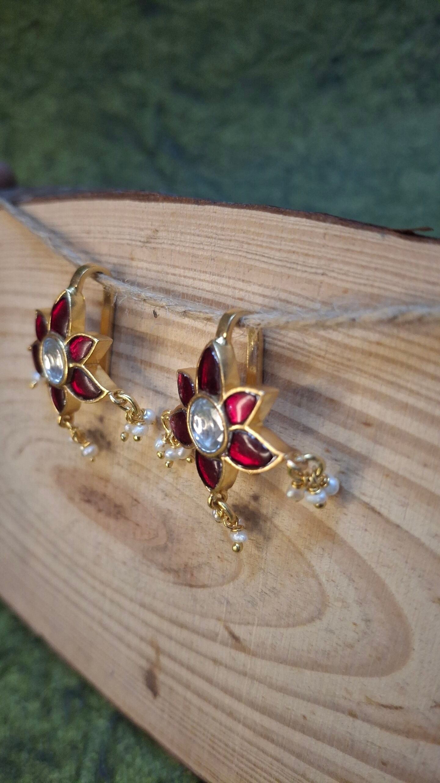 Introducing our Red Kundan Flower Bugadi Earrings, designed with a stunning 6-petal floral motif in deep ruby red.