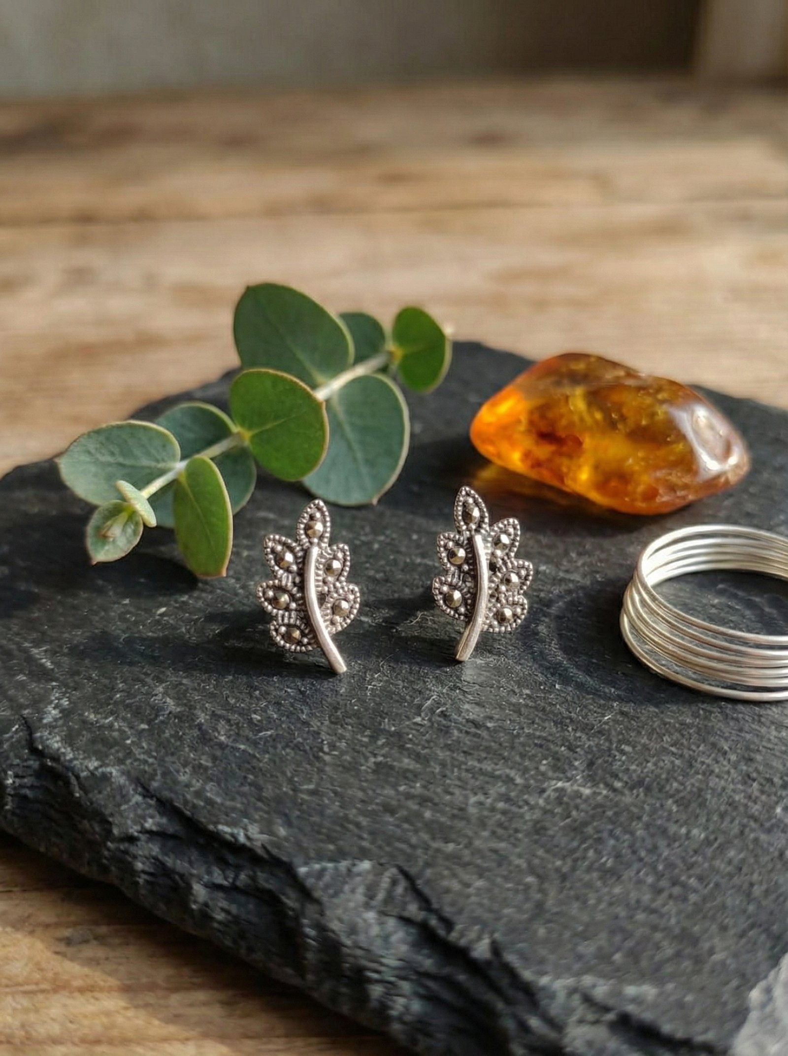 These exquisite Oxidised Silver Leaf Stud Earrings showcase timeless craftsmanship with intricate detailing inspired by delicate leaves. Perfect for daily wear or special occasions, these studs add a touch of elegance and sophistication to any outfit.